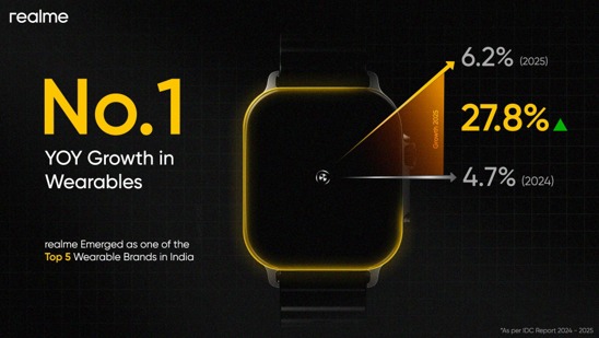 कुल बाजार में गिरावट के बावजूद, realme 2025 में भारत के शीर्ष पांच वेयरेबल ब्रांड्स में से एक के रूप में उभरा। realme ने 2024 की तुलना में 27.8% की प्रभावशाली साल-दर-साल वृद्धि दर्ज की और कुल वेयरेबल श्रेणी में 6.2% बाजार हिस्सेदारी हासिल की। यह वृद्धि ब्रांड की बढ़ती उपस्थिति और युवा उपभोक्ताओं के बीच मजबूत स्वीकृति को दर्शाती है, वह भी एक चुनौतीपूर्ण बाजार चक्र के दौरान।